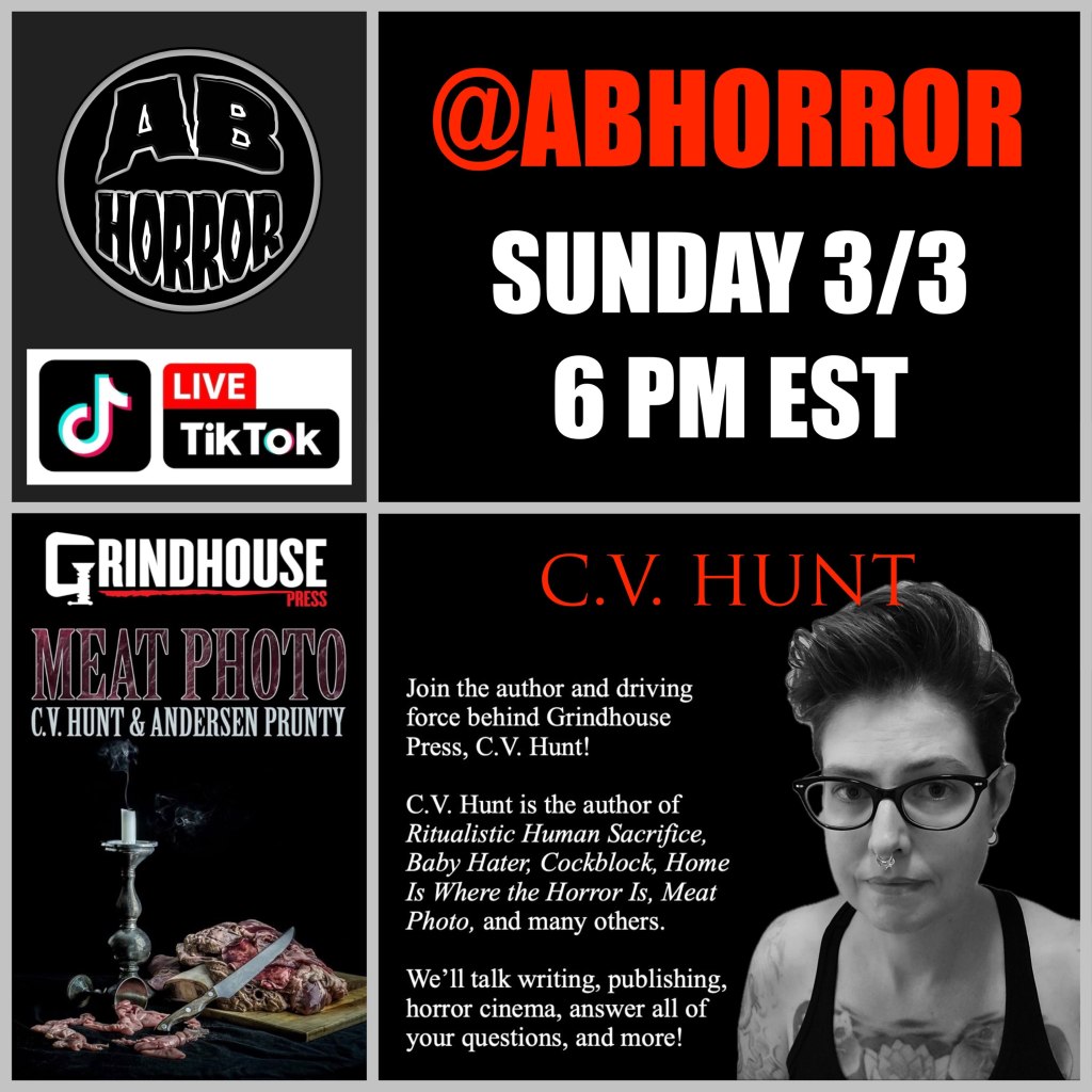 It’s C.V. Hunt, owner of Grindhouse Press. I’ll be doing a live interview on TikTok this Sunday at 6PM EST. Follow @abhorror on TikTok to join in and ask questions. Plus there’s a giveaway. Watch to see how you can win.